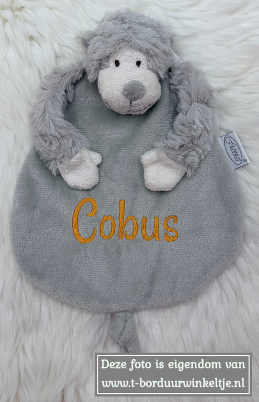 Het tutdoekje van Cobus is geborduurd met lettertype Naomi in de kleur okergeel (op aanvraag).